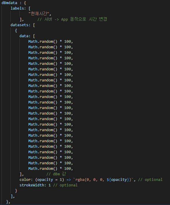 여러가지 그래프 출력 함수를 제공하지만 가장 기본인 LineChart를 사용하였으며, 그래프 작성시 필요한 값은 datasets->data 배열에 저장해둠.
